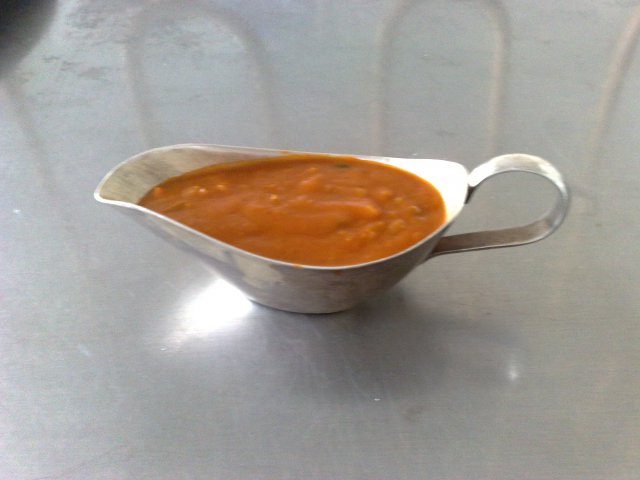 Готовим соус красный: Сварить коричневый бульон из обжаренных мясных костей и процедить, охладить до 50 С. Всыпать просеянную, пассерованную без жира пшеничную муку (красная пассеровка) и размешать проволочным венчиком так, чтобы получилась однородная масса без комков. После чего положить пассерованный томат-пюре, пассерованные коренья и лук, довести до кипения и всё:))