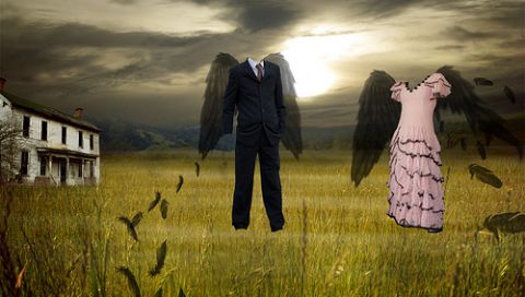 Обои для PSP » 3D » Костюм и платье с крыльями на фоне грозы