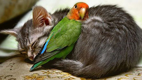 котенок спит рядом с попугаем