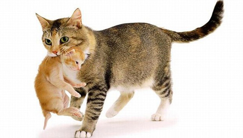 кошка тащит котенка