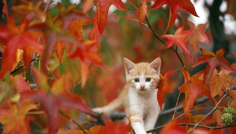 Обои для PSP » Животные  »  Кошки » Котенок в листве деревьев