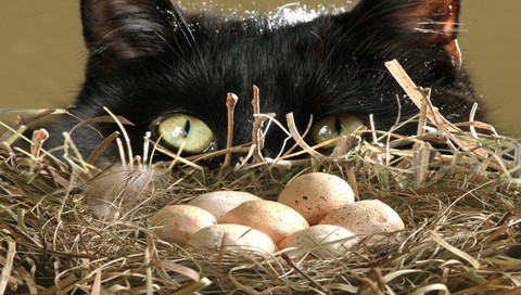 Обои для PSP » Животные  »  Кошки » Кошка смотрит в гнездо с яйцами