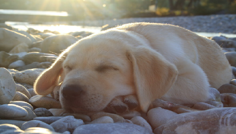 Собака спит на камнях