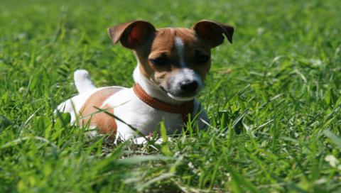 Собака лежит в траве