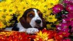Собака на фоне цветов