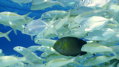 Обои для PSP » Животные  »  Обитатели моря » Стая белых рыбок
