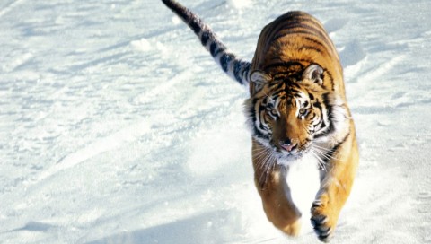 Тигр скачет по снегу