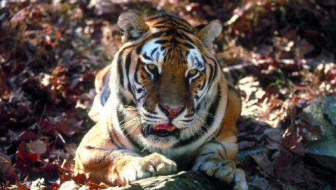 Обои для PSP » Животные  »  Тигры » Тигр на листьях