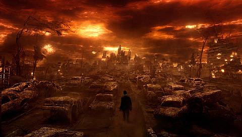 Обои для PSP » Фэнтези » Мужщина в городе сгоревщих машин