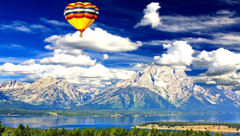 Воздушный шар над озером и горами