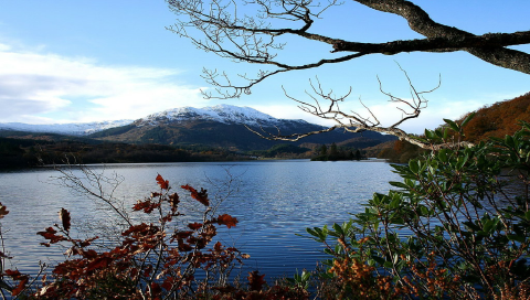 Озеро на фоне снежных гор и неба