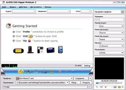 ImTOO DVD Ripper Platinum - мощная программа для копирования DVD, которая поможет Вам быстро преобразовать DVD в любой формат видео файлов. Программа совмещает функции DVD - риппера и DVD - аудиориппера, т.е. она сможет конвертировать DVD во все популярные форматы видео, такие как AVI, MPEG, WMV, DivX, RM, MOV, MP4, 3GP, 3G2, Xvid, ASF и т.п. и популярные аудио форматы - MP3, WAV, WMA, AAC, AC3, M4A, MP2, OGG. Поддерживает конвертацию для iPod, мобильных телефонов, PSP, DVD, MP3 и MP4 плееров.